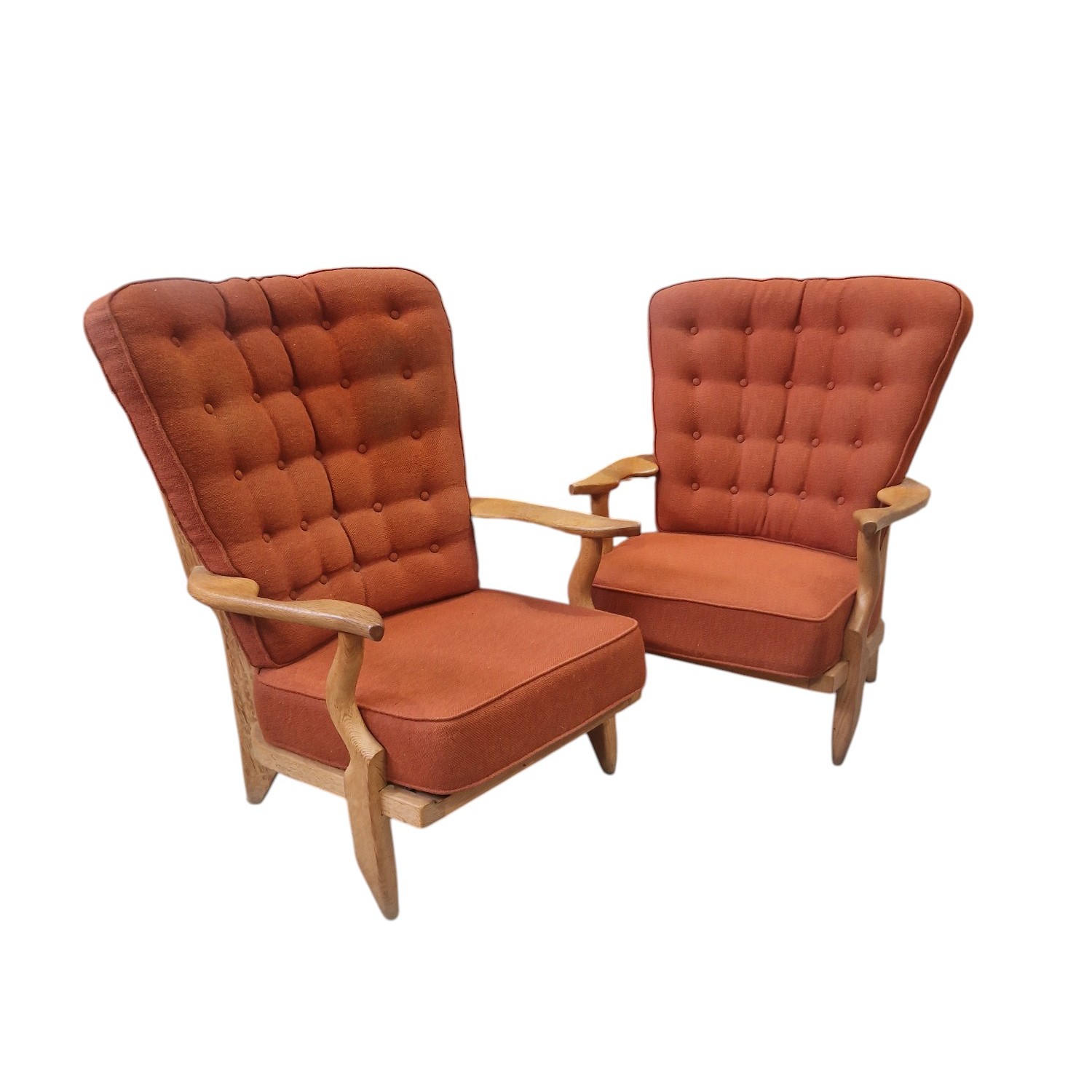 Set de deux fauteuils en chêne clair massif, design Guill;erme et Chambron. Ces fauteuils, grand repos et caqueteuse, sont en très bon état.