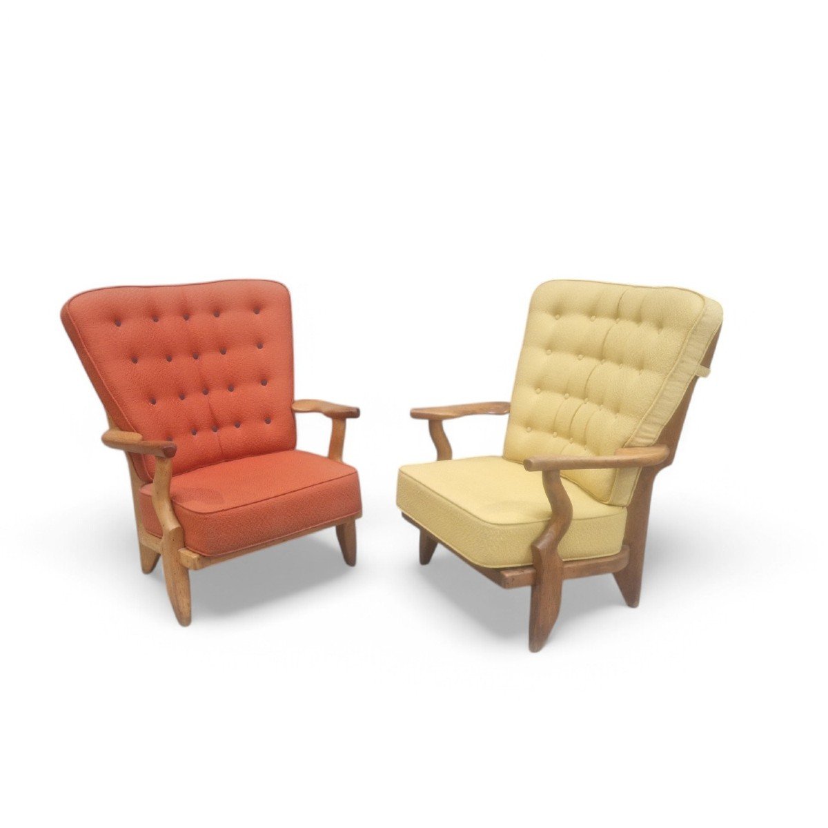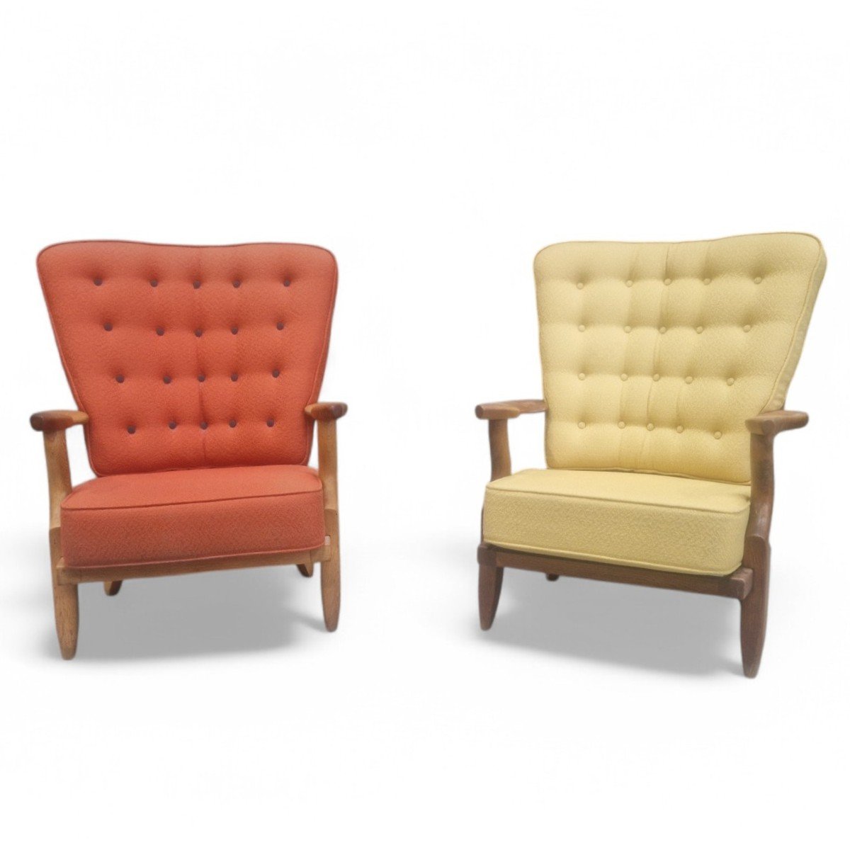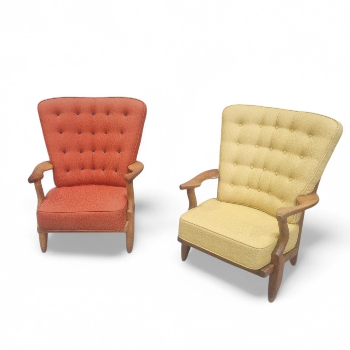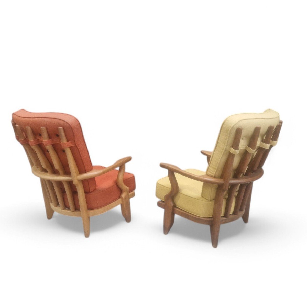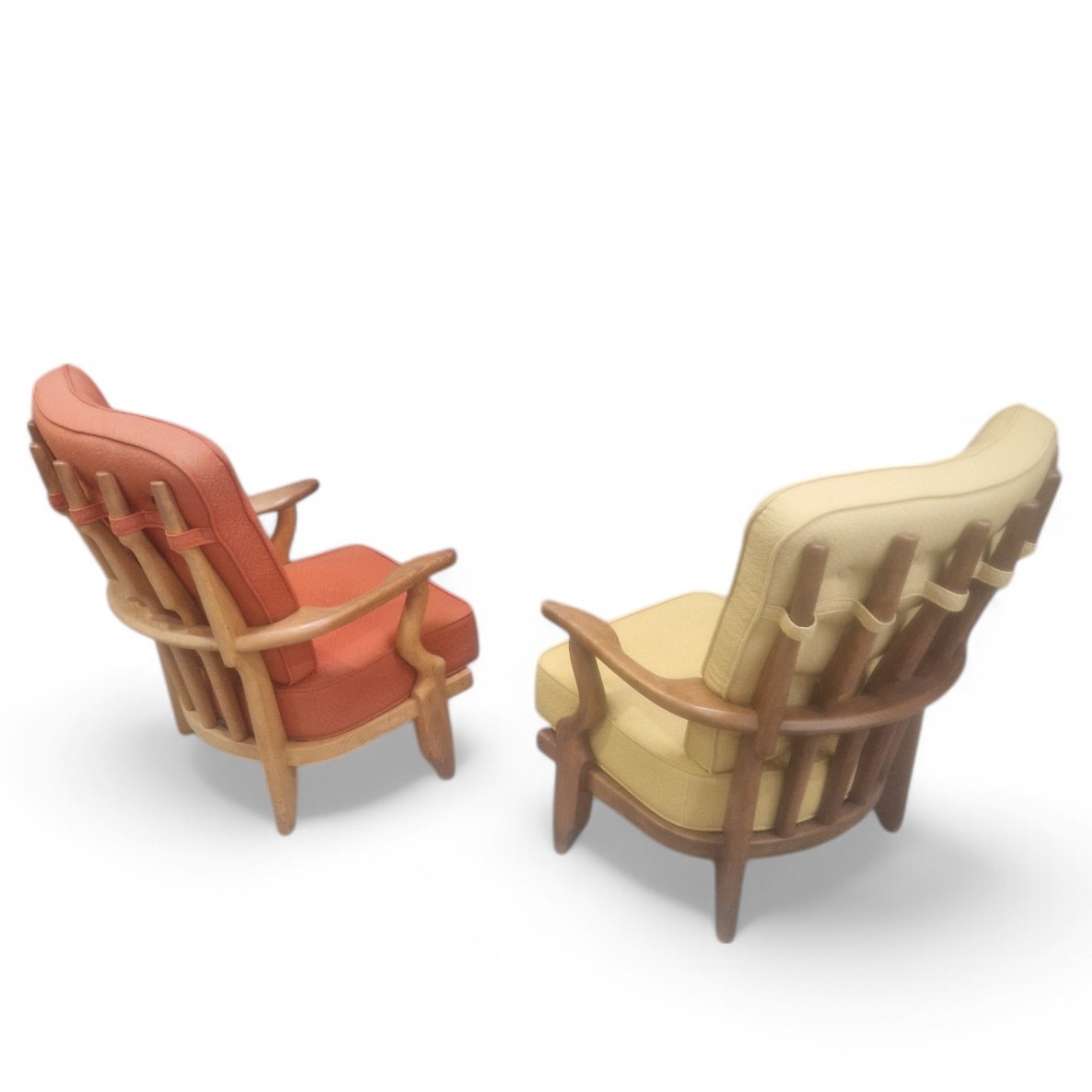 Set de 2 fauteuils « repos » dits caqueteuses en chêne massif par Guillerme et Chambron pour « Votre Maison » éditeur. Ces fauteuils strictement identiques présentent une légère différence de patine certainement due à une exposition différente aux rayons UV.